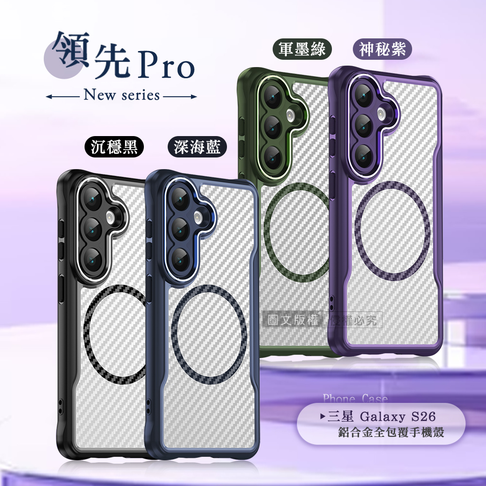 領先Pro 三星 Galaxy S26 鋁合金鏡頭框 碳纖紋磁吸防摔殼 手機殼(沉穩黑)