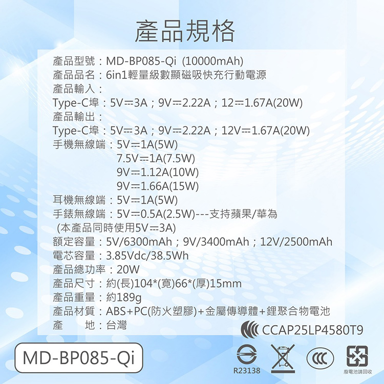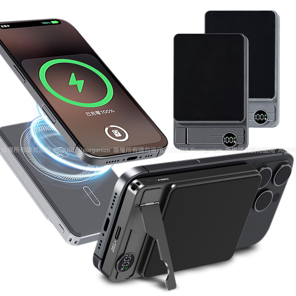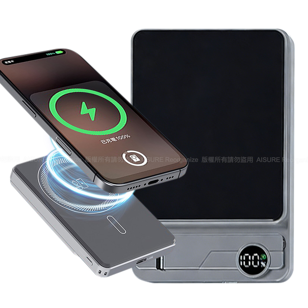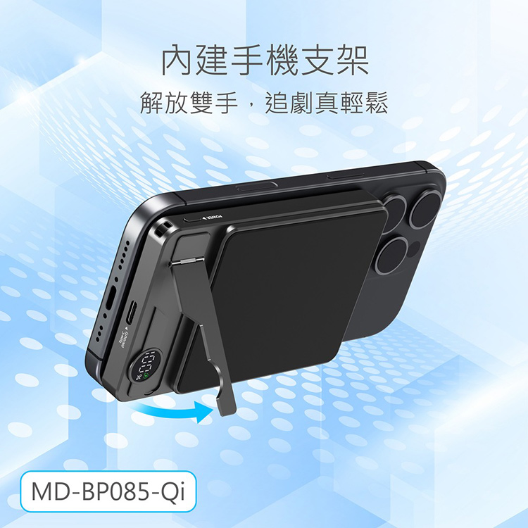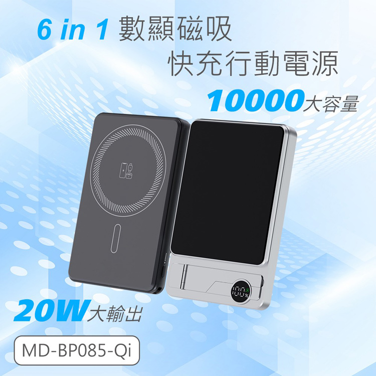 MiniQ MD-BP085-Qi 10000mah 6合1 磁吸數顯隱型支架20W快充行動電源-銀