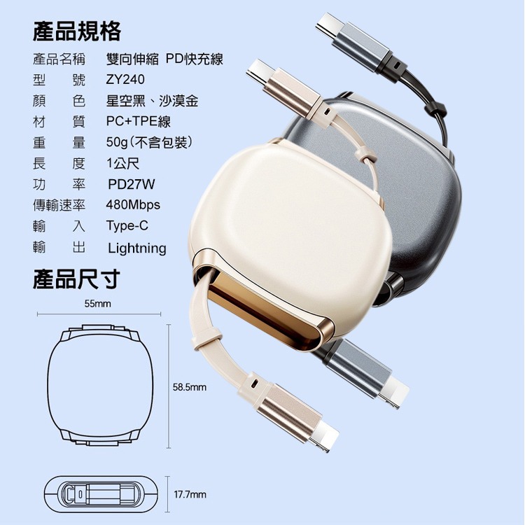 雙向伸縮不卡線:3檔卡點,最長1米,拉了就充