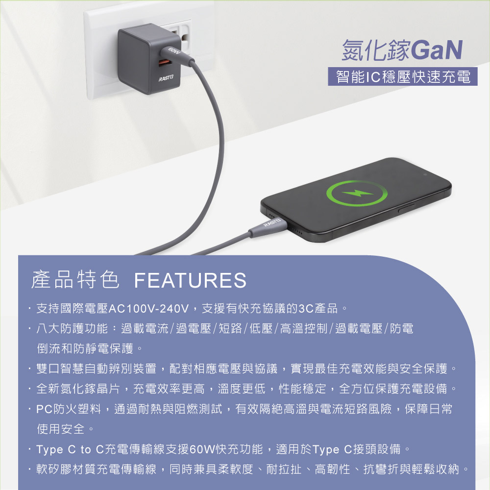 RASTO RB58 20W氮化鎵PD+QC3.0快充贈60W C to C軟矽膠快充傳輸線