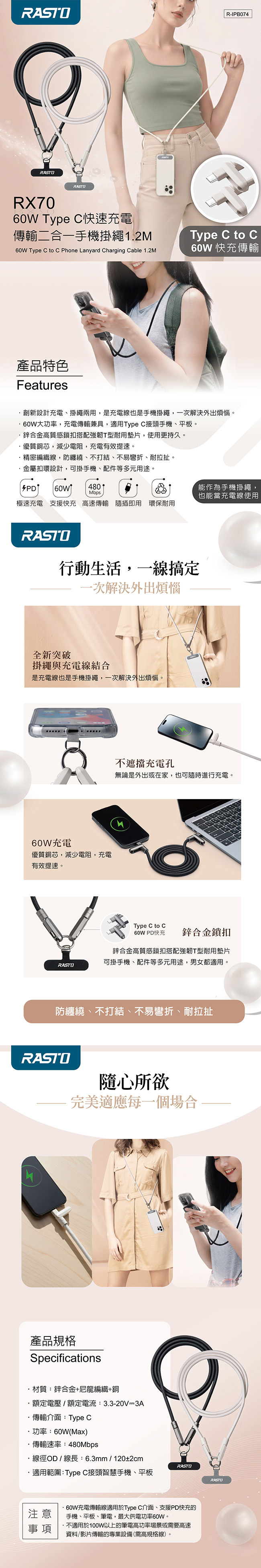 RASTO RX70 60W Type C快速充電傳輸二合一手機掛繩1.2M-黑
