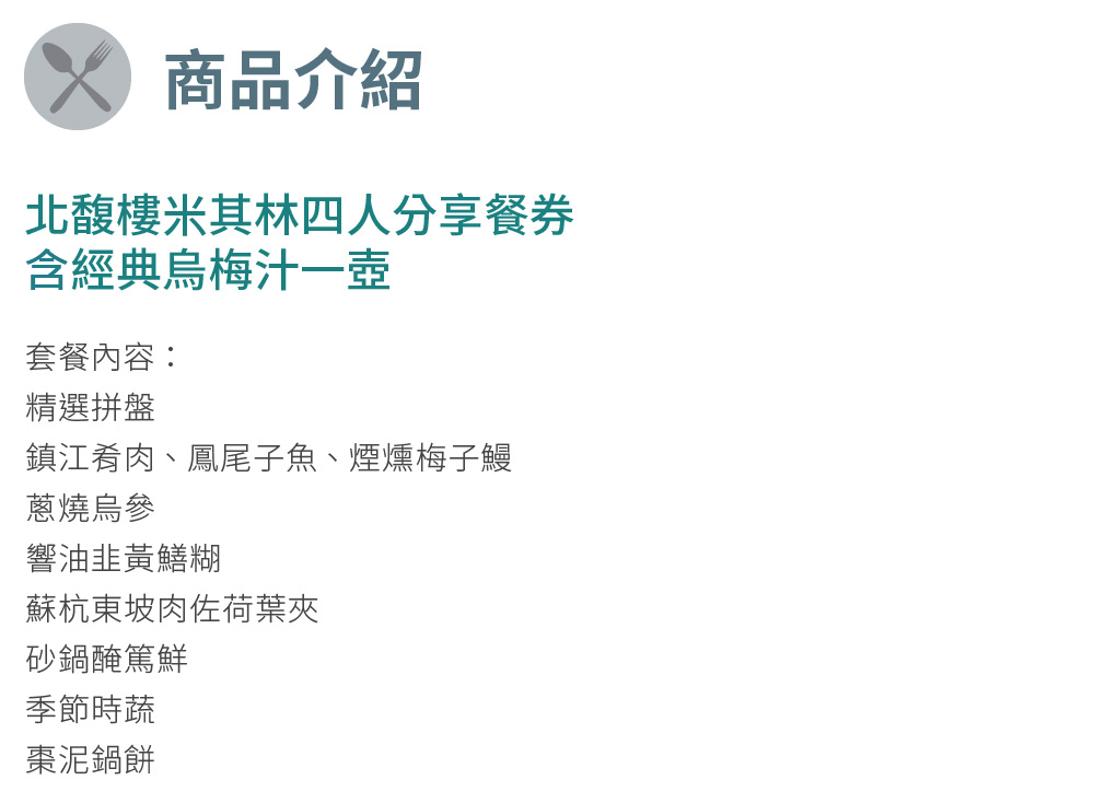 【國聯大飯店】北馥樓平日米其林四人分享餐券(+400假日可使用)含經典烏梅汁一壺|下殺76折(MO26)