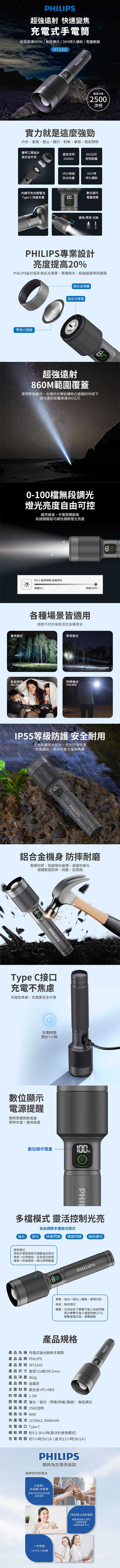 PHILIPS飛利浦 2500流明 IP55變焦鋁合金手電筒 SFL5102