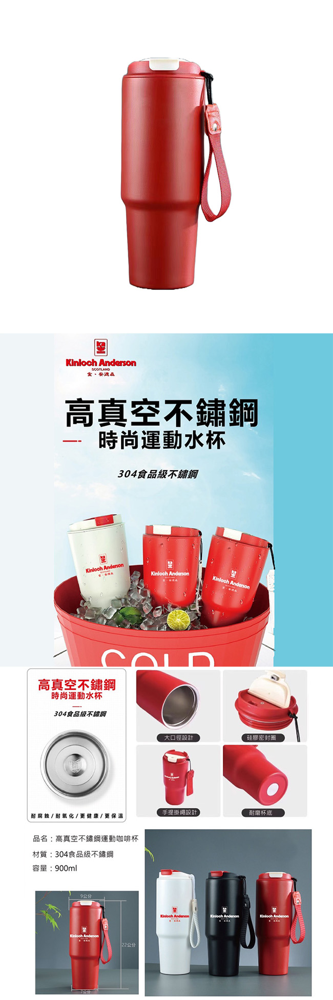 金安德森 304不鏽鋼高真空運動咖啡杯(附提繩)900ml 紅色
