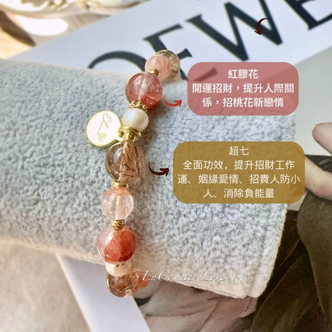 紅膠花水晶是水晶在形成過程中,受到壓力內部出現裂隙,而水晶旁邊的礦物質「趁虛而入」,滲透到了水晶內部。大都成片狀呈現,有的形如花狀,故稱為「膠花水晶」,具有開運招財,吸引貴人及正財運。對於幫助人際關係及桃花新戀情也有很大的功效。