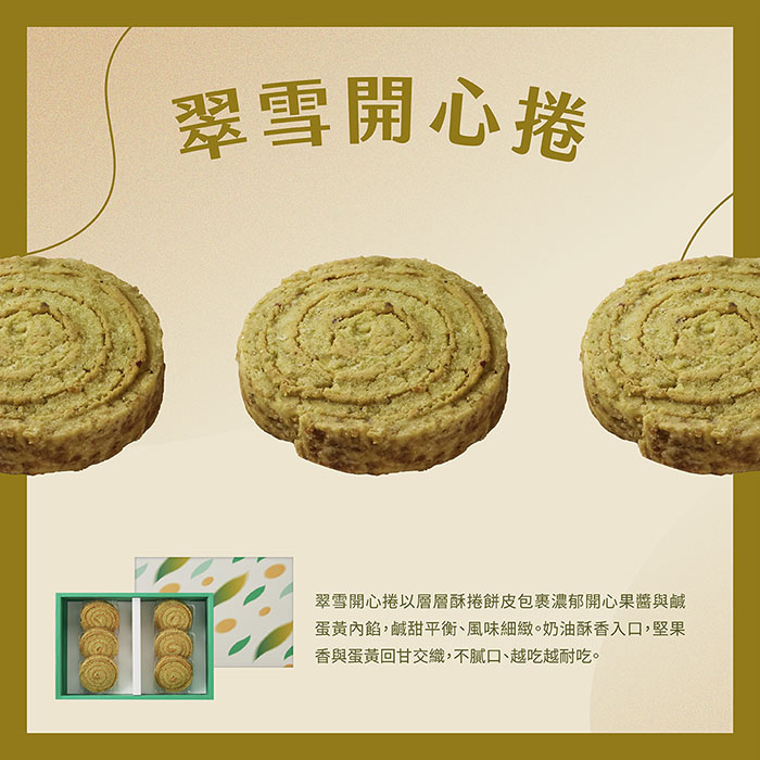 翠雪開心捲以層層酥捲餅皮包裹濃郁開心果醬與鹹蛋黃內餡,鹹甜平衡、風味細緻。