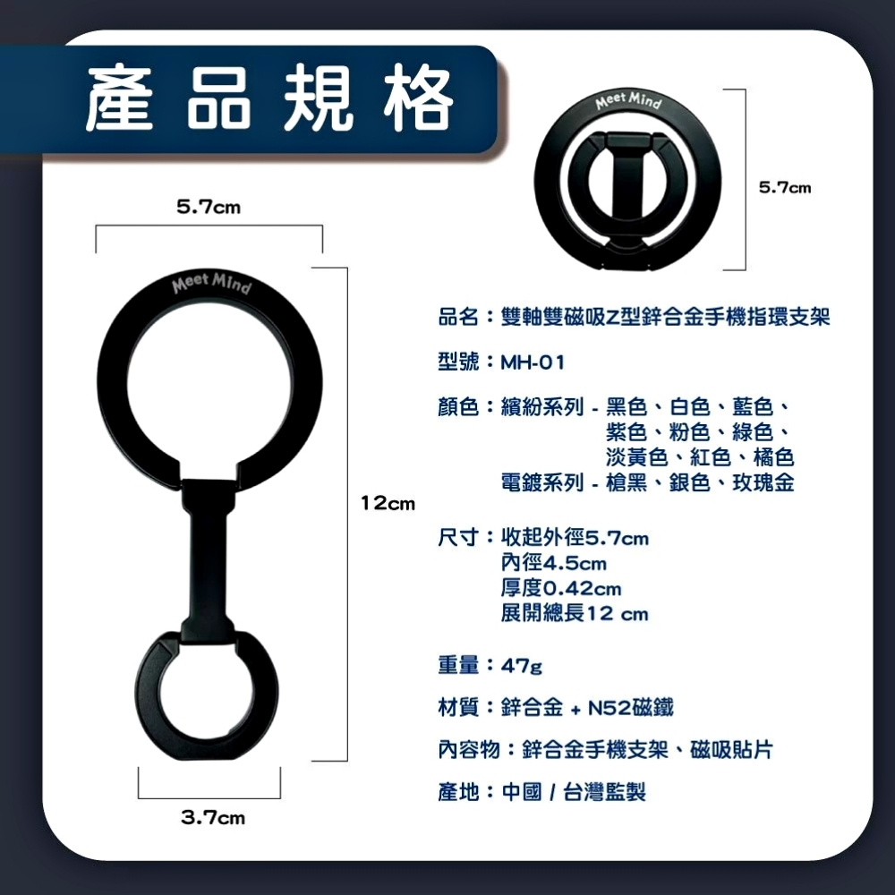 Meet Mind 雙軸雙磁吸Z型鋅合金手機指環支架-繽紛-藍色