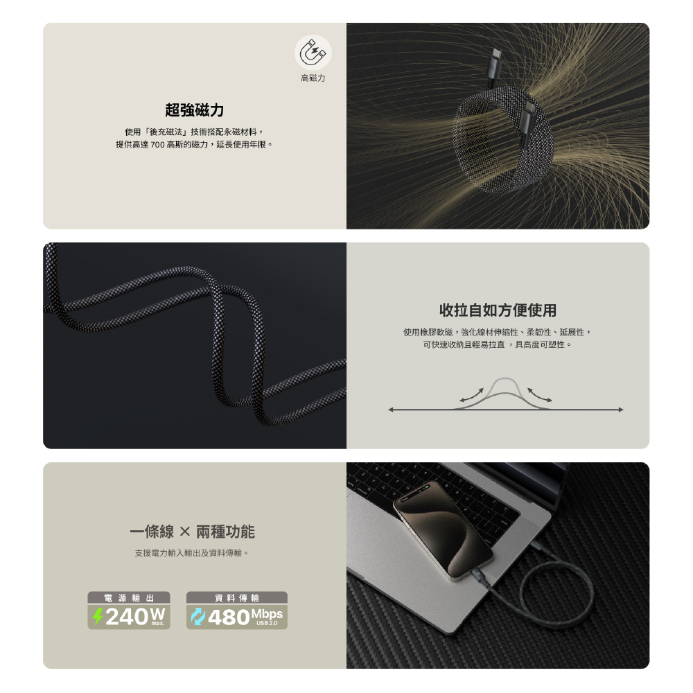 【亞果元素】MP200 USB-C 對 USB-C 240W 磁吸充電線 2M-黑