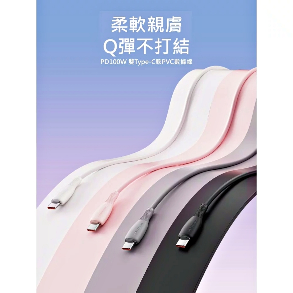 VENTION 威迅 TRW系列 USB-C 2.0 to Type-C 100W PD 5A傳輸充電線-軟PVC款-1M-黑色