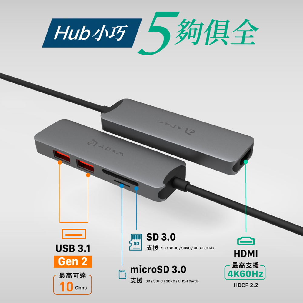 【亞果元素】Hub A05 USB-C Gen2 五合一多功能高速集線器-灰