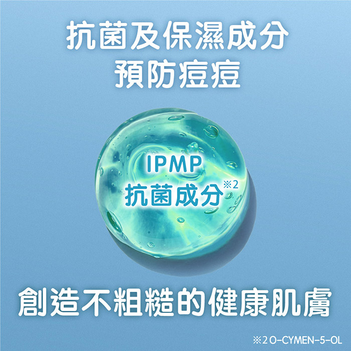 添加甘草酸鉀(保濕)、PMP抗菌配方及持久型玻尿酸,淨化毛孔、預防痘