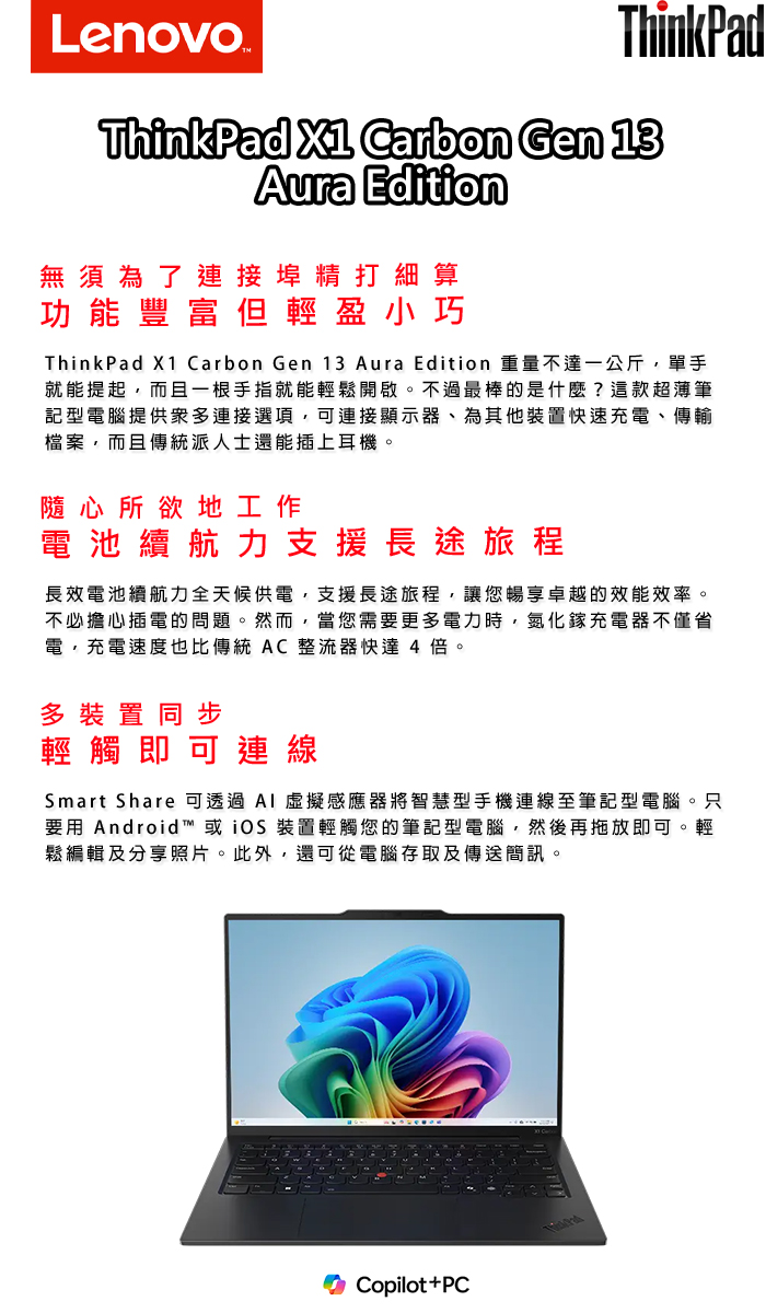 《Lenovo 聯想》 ThinkPad X1 Carbon Gen 13(14吋WUXGA/Ultra 7 258V/32G/1TB SSD/W11Pro)