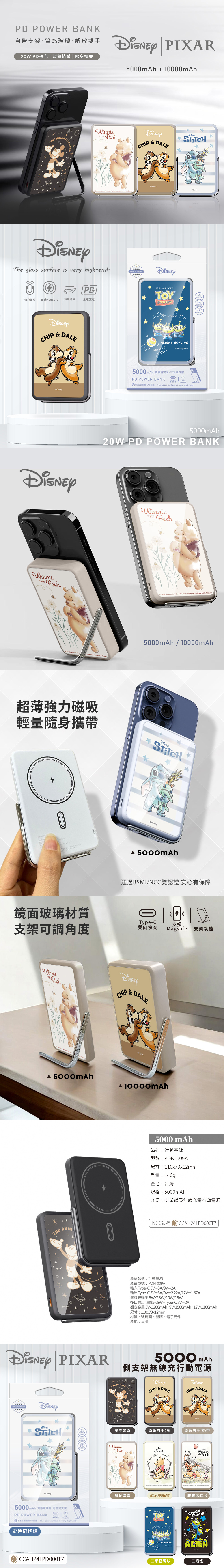 【Disney迪士尼】質感玻璃面 磁吸無線充側支架行動電源10000mAh_跳跳虎維尼