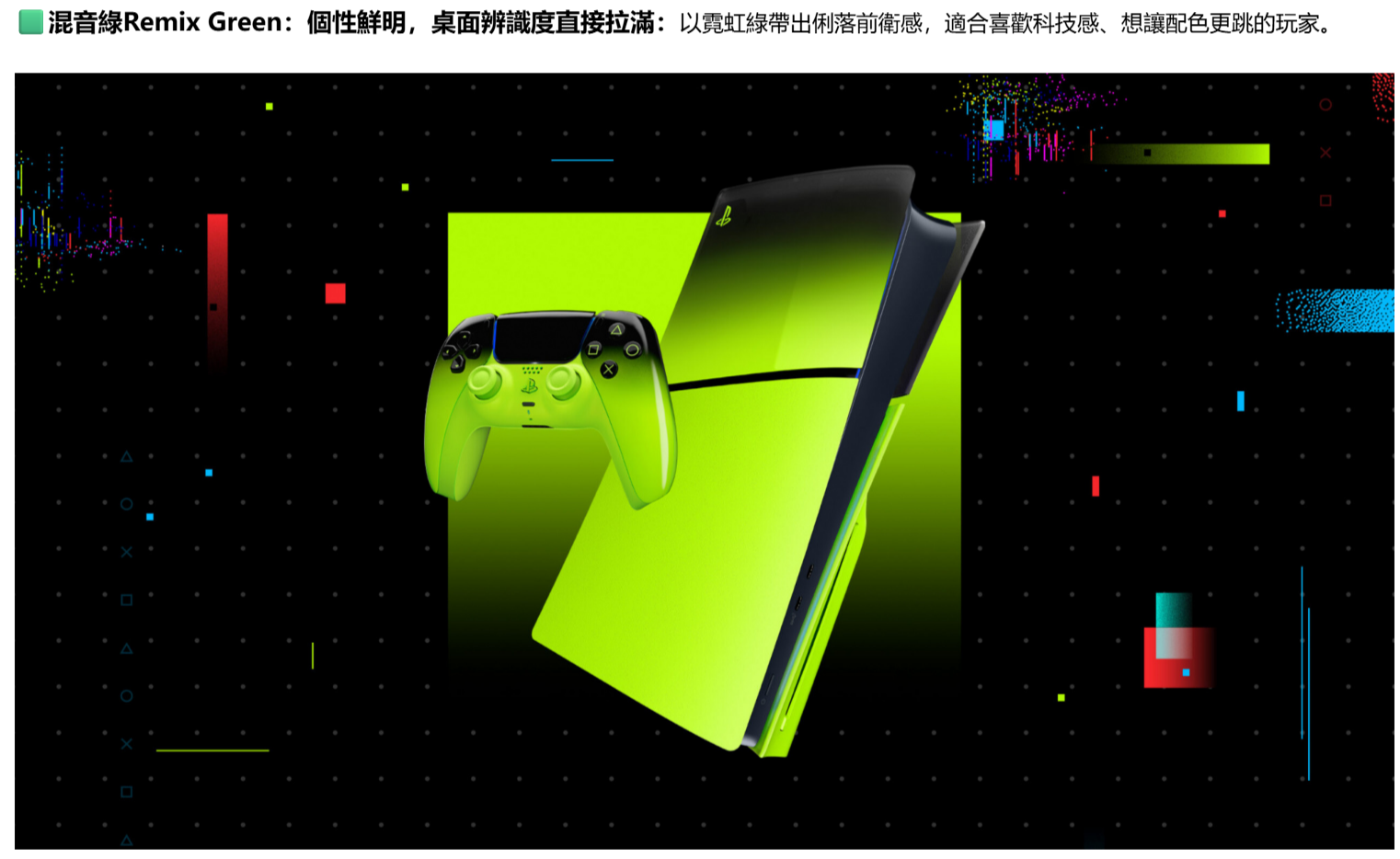 ★PS5 主機護蓋的三款耀眼設計。亮面黑轉變為鮮明霓虹,每款設計均為遊戲配備帶來全新美學。
