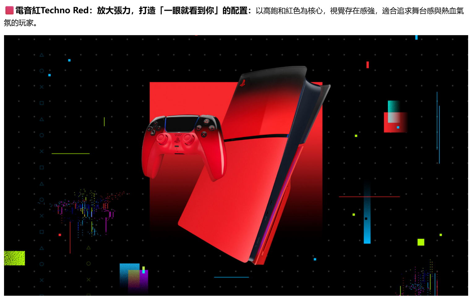 ★PS5 主機護蓋的三款耀眼設計。亮面黑轉變為鮮明霓虹,每款設計均為遊戲配備帶來全新美學。