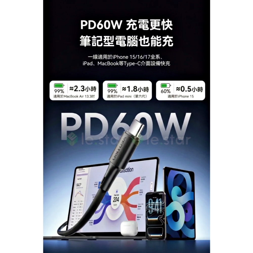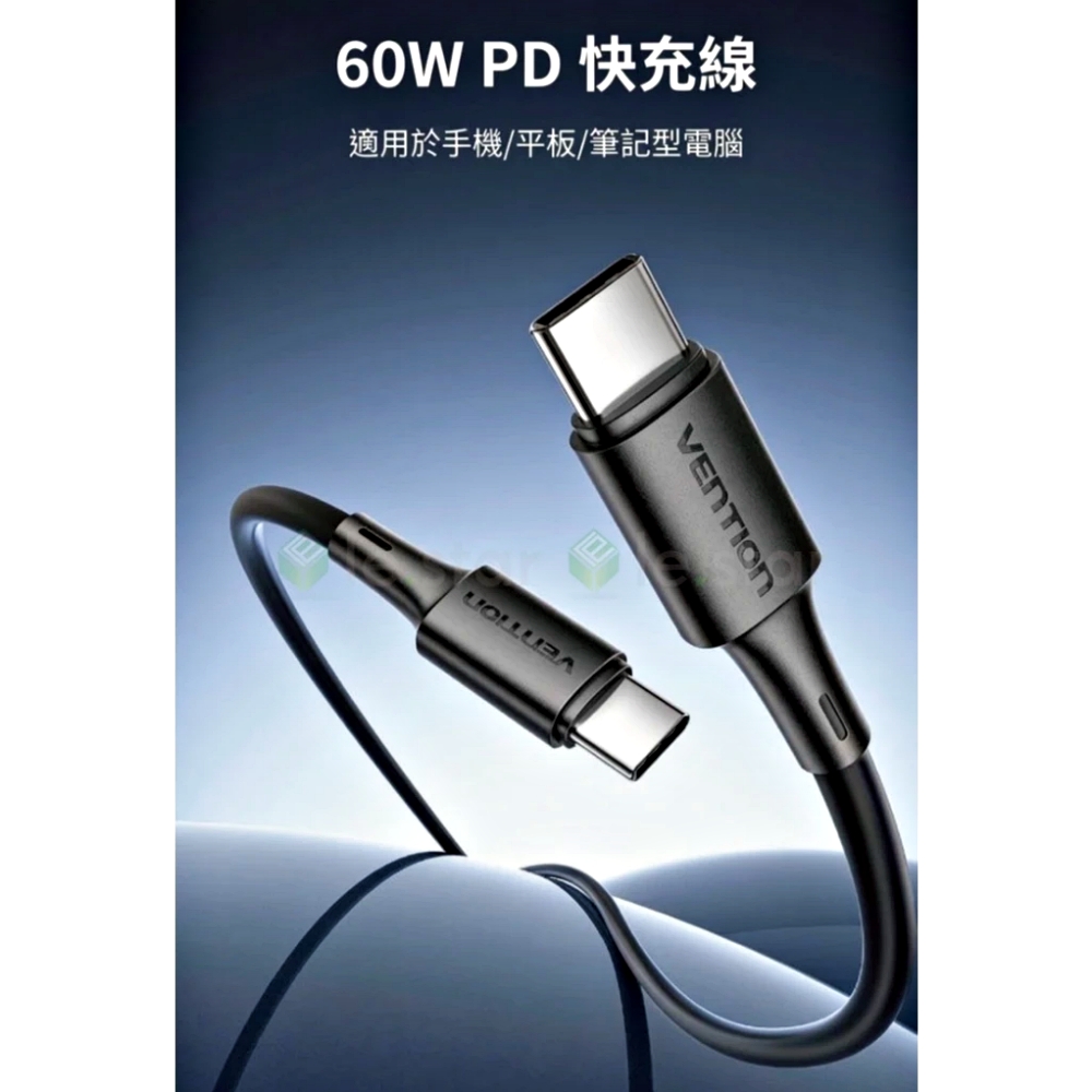 VENTION 威迅 TRY系列 USB-C 2.0 to Type-C 60W PD 3A傳輸充電線 0.9M
