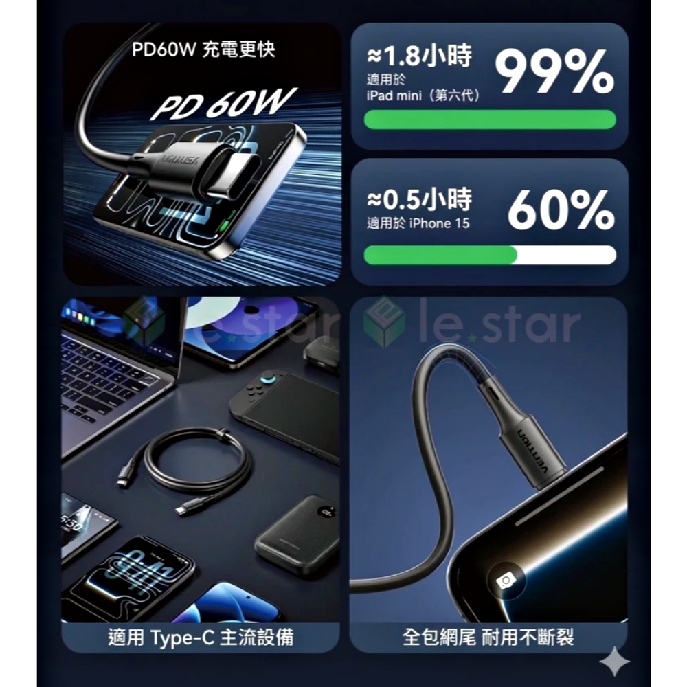 VENTION 威迅 TRY系列 USB-C 2.0 to Type-C 60W PD 3A傳輸充電線 0.25M