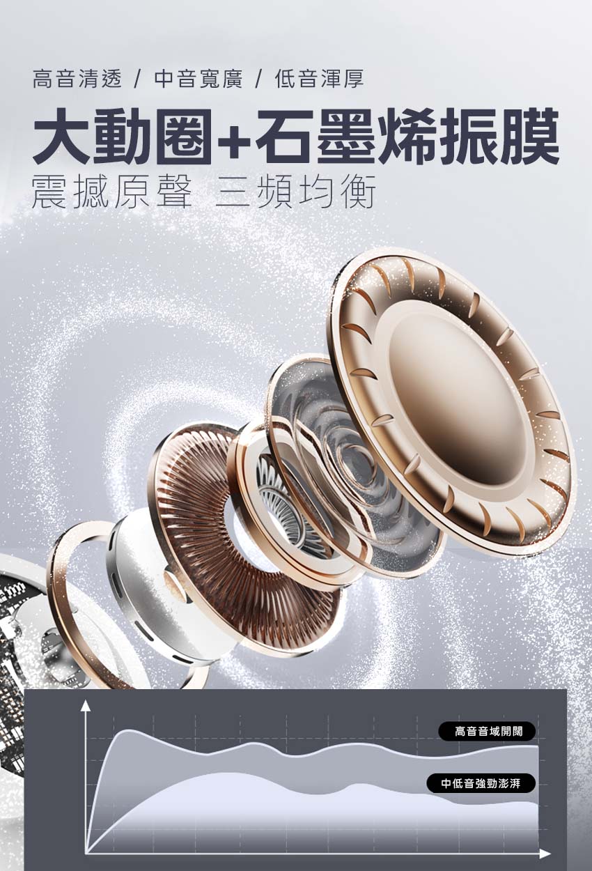 採用超越同級真銅環之多層複合振膜,單體能維持清晰音質下同時強化低音表現。