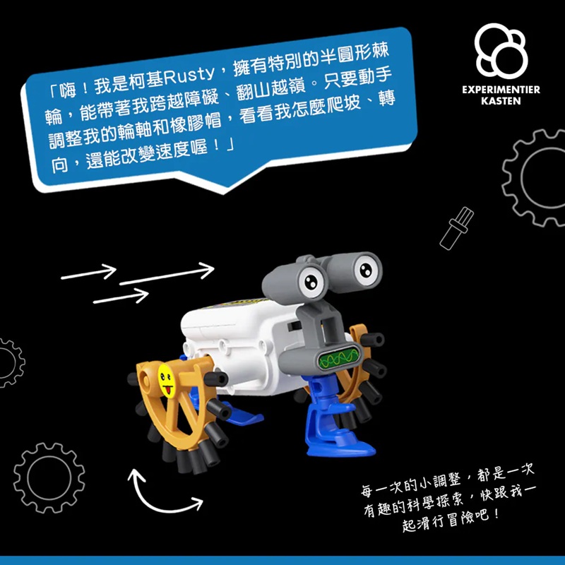 柯基 Rusty 在翻越障礙與改變行進方向時,會因輪軸調整而產生重心變化。