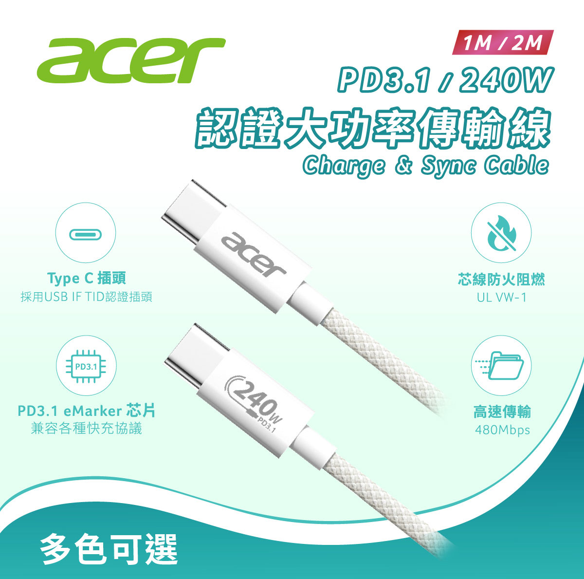 【Acer 宏碁】PD3.1 240W大功率2M快速充電傳輸線 OCB4D1黑/OCB4F1白(Type-C to Type-C)