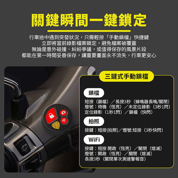 ★三鍵式鎖檔鍵:鎖檔(緊急蜂鳴呼救快鍵)/拍照/WiFi