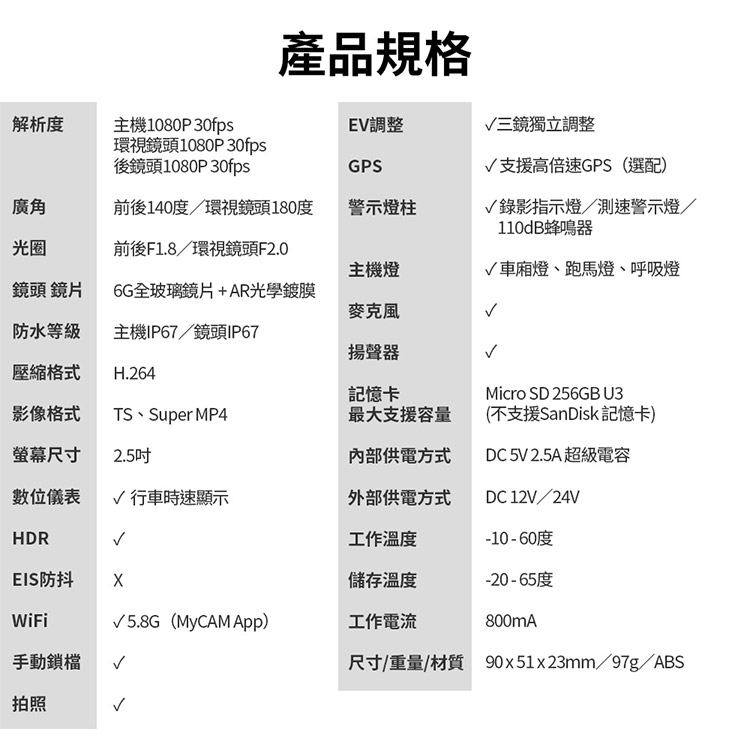 ★前/環視/後鏡頭1080P 30fps HDR
