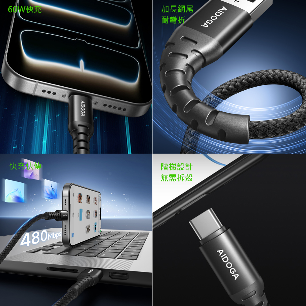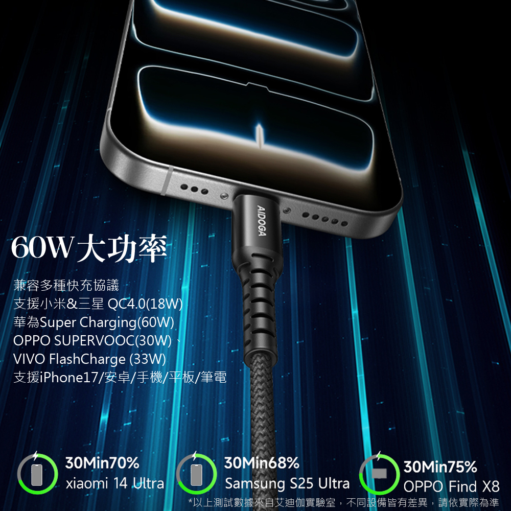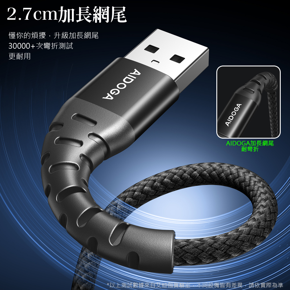 AIDOGA 艾迪伽 Type-C充電線傳輸線快充線 加長網尾 安卓 NyzerFlex 1.2M 支援iPhone17系列/安卓