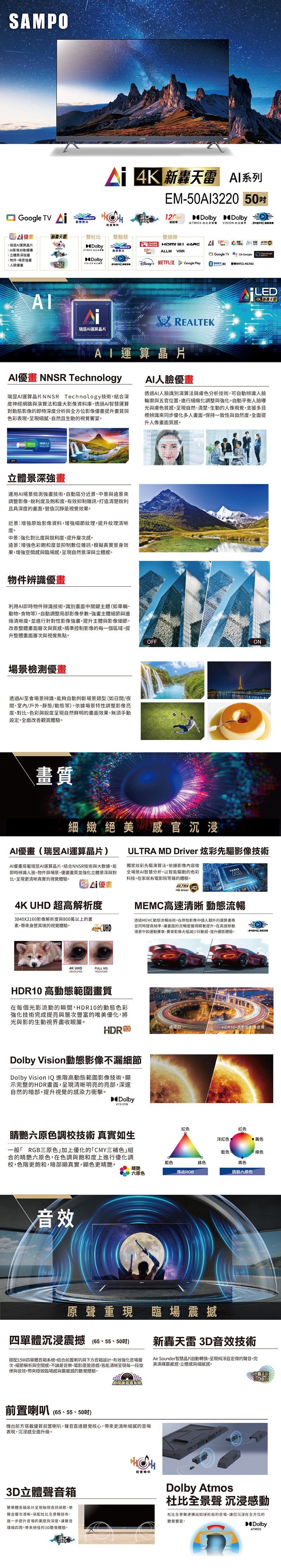 (送基本安裝)聲寶 50吋4K AI新轟天雷GoogleTV液晶顯示器 EM-50AI3220