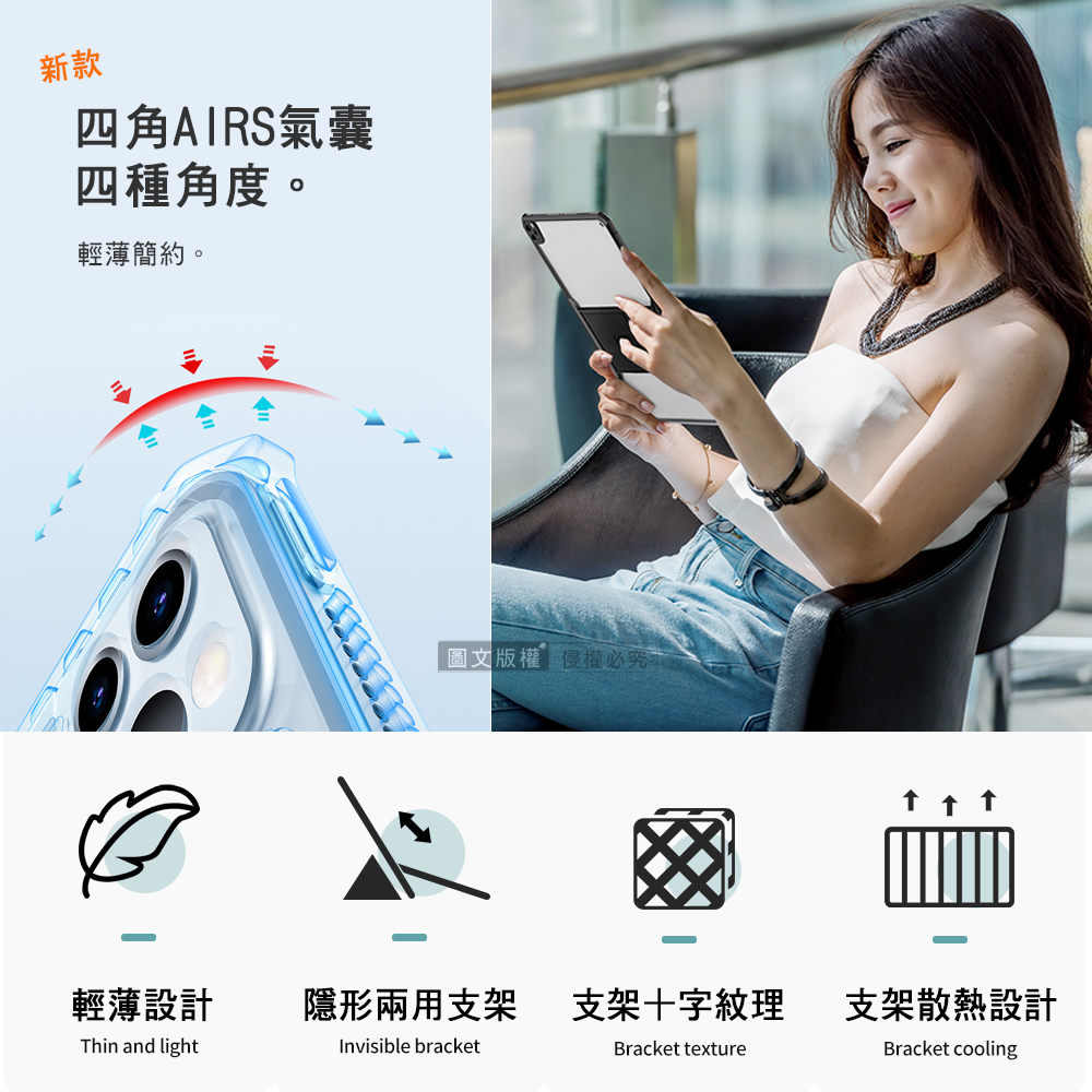 高韌性材質,新款四角AIRS緩衝氣囊,易拆卸,不傷機