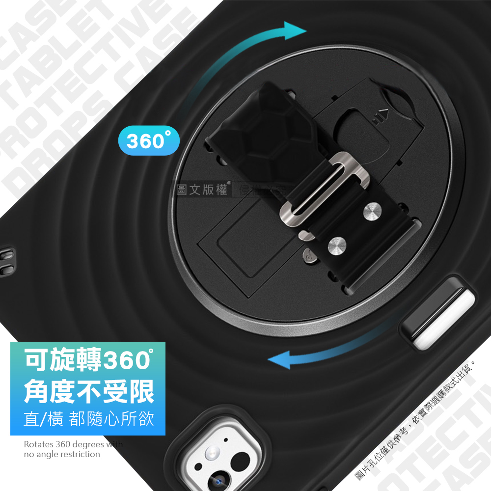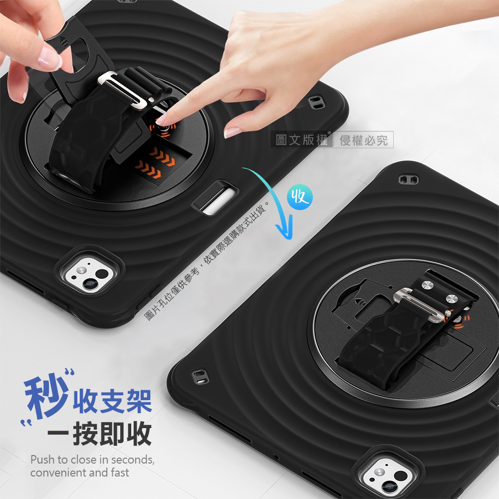 盔甲MAX PRO 2026 iPad Air8 11吋 M4 全包覆矽膠PC硬蓋防摔保護殼套 秒收旋轉支架 附側背帶(經典純黑)