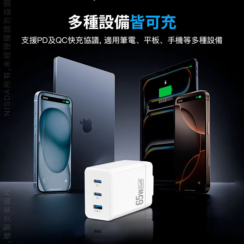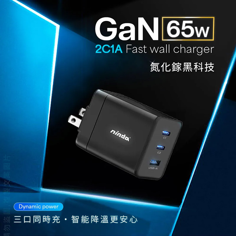 Nisda GaN 氮化鎵 2Type-C+1USB-A 三孔旅充頭(65W)(白色)