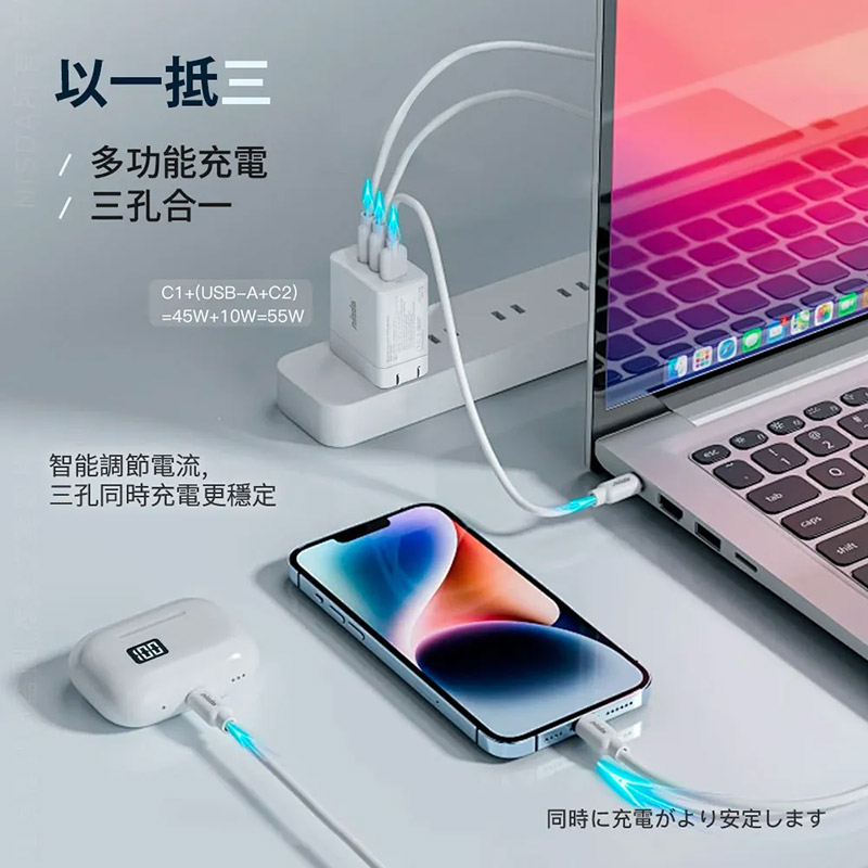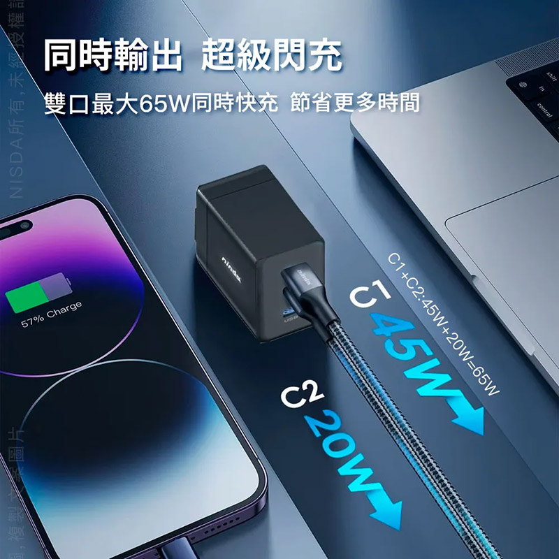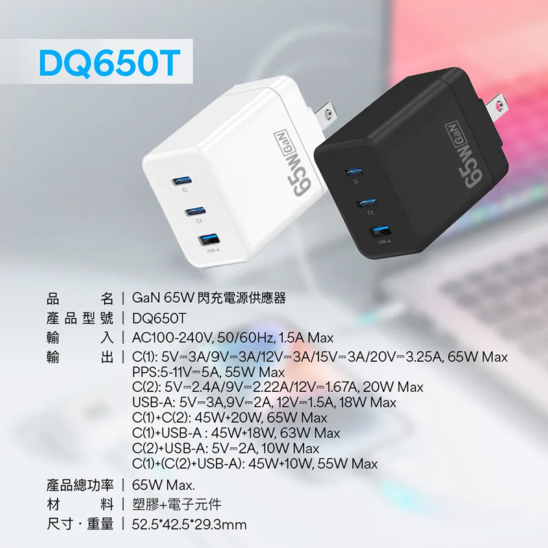.65W Max大功率 三口輸出(USB x1+Type-C x 2) 效率更高