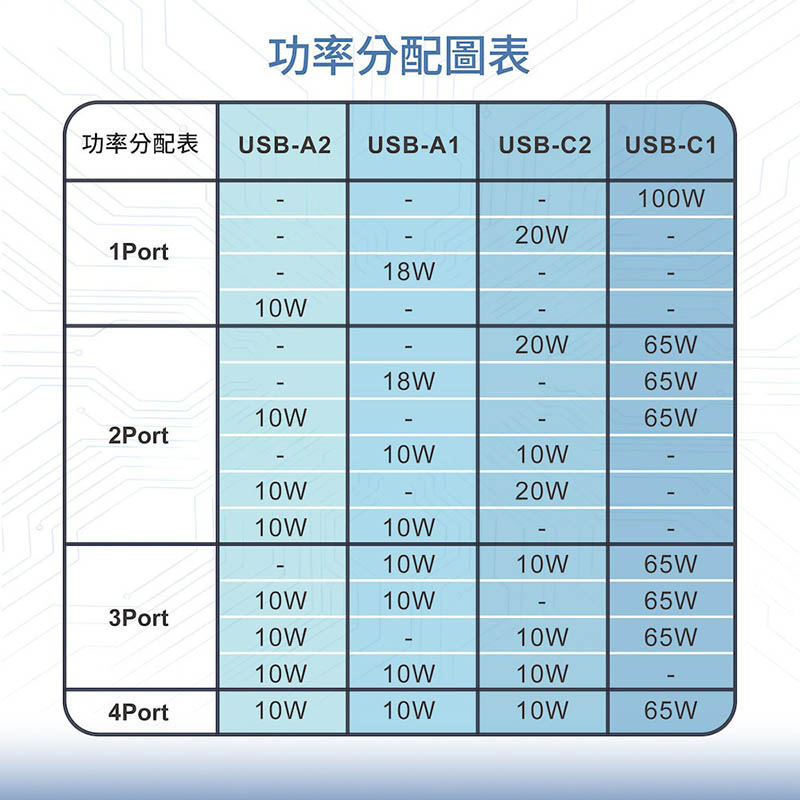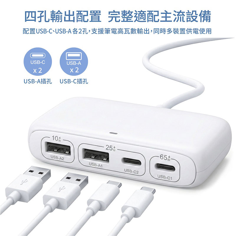 配置USB-C、USB-A各2孔,支援筆電高瓦數輸出,同時多裝置供電使用