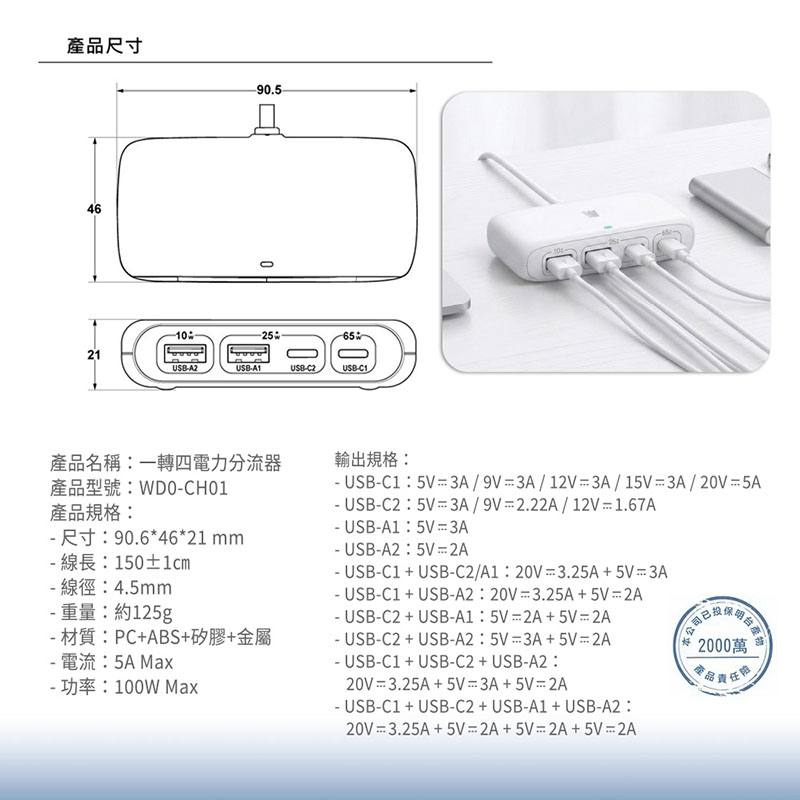 Wephone 100W 一轉四電力分流器(2C2A) E-Marker晶片1.5M (白色)