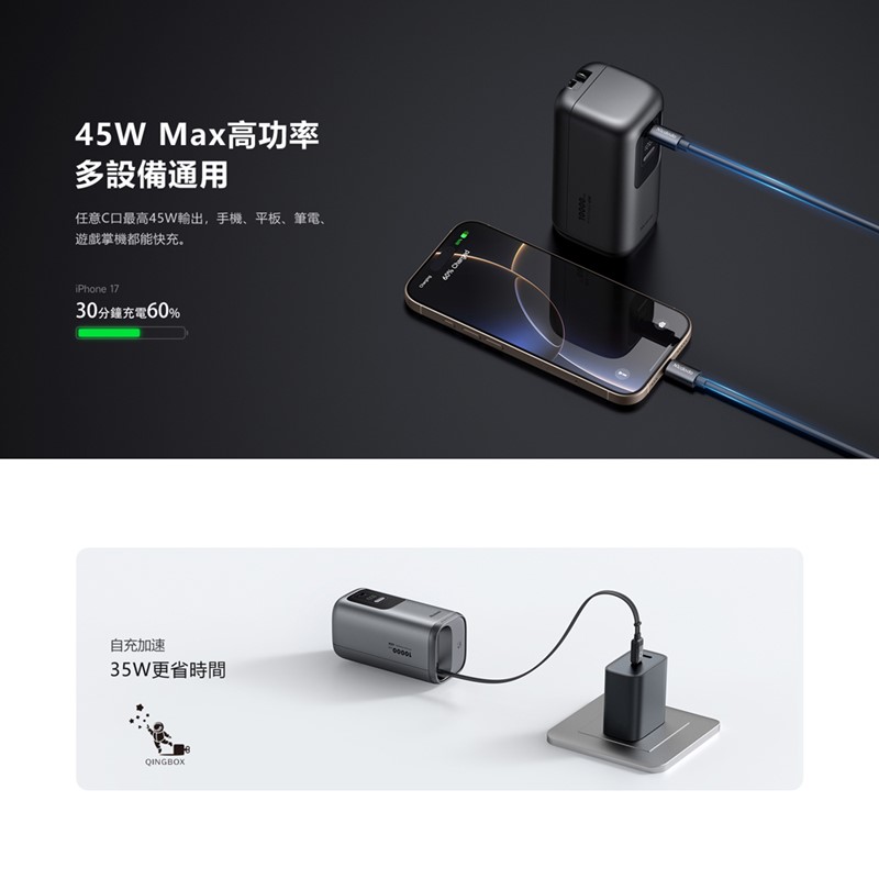 內容物:3合1牆插款USB-C伸縮線數顯行動電源10000mAh 45W,充電線