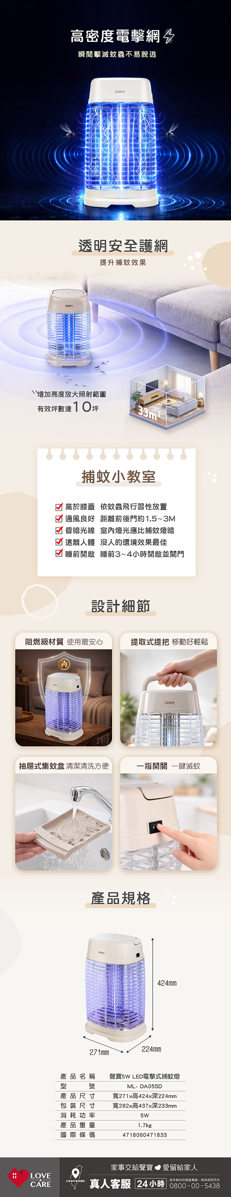 SAMPO聲寶 5W LED省電抗菌電擊式捕蚊燈 ML-DA05SD