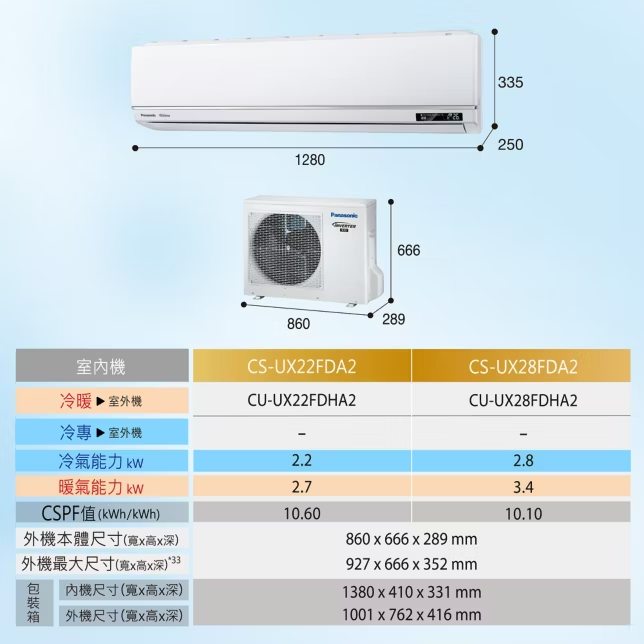 Panasonic3-4坪超高效旗艦系列冷暖空調CS-UX22FDA2/CU-UX22FDHA2
