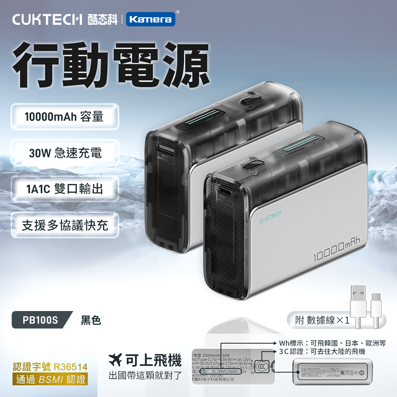 【Wh+CCC標示】CUKTECH 酷態科 PD 30W 口袋型 PD快充 行動電源 10000mAh (PB100S)-黑色