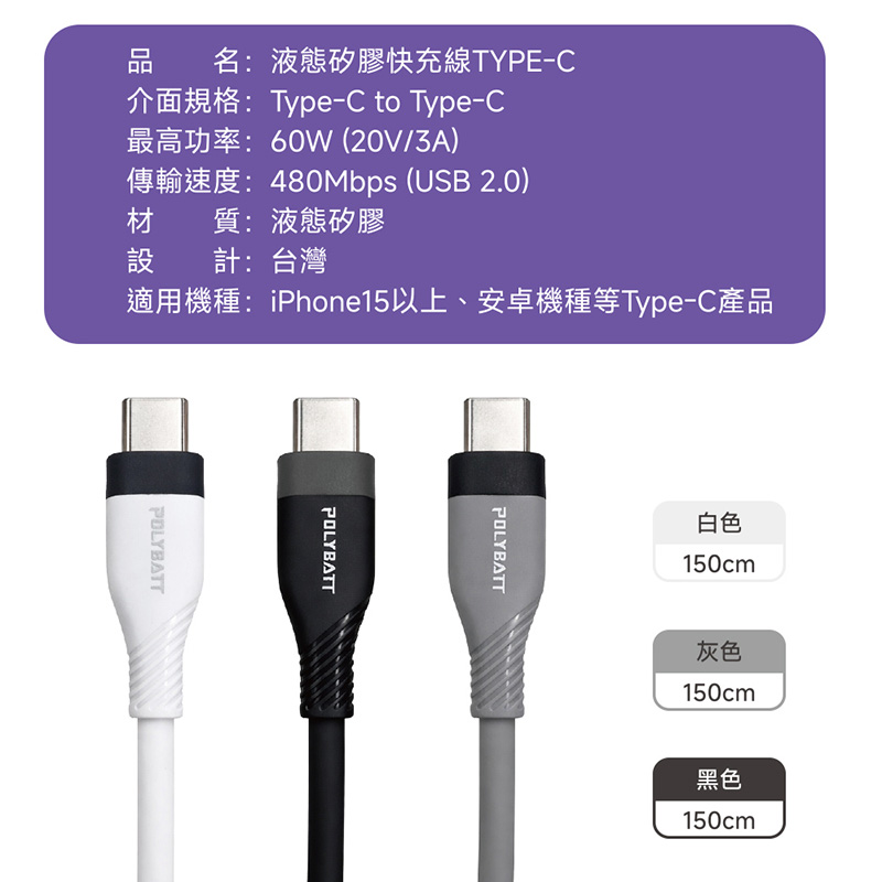 快充線 60W疾速快充,頂級柔膚觸感,手機筆電都能充