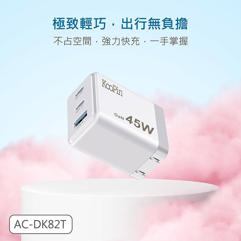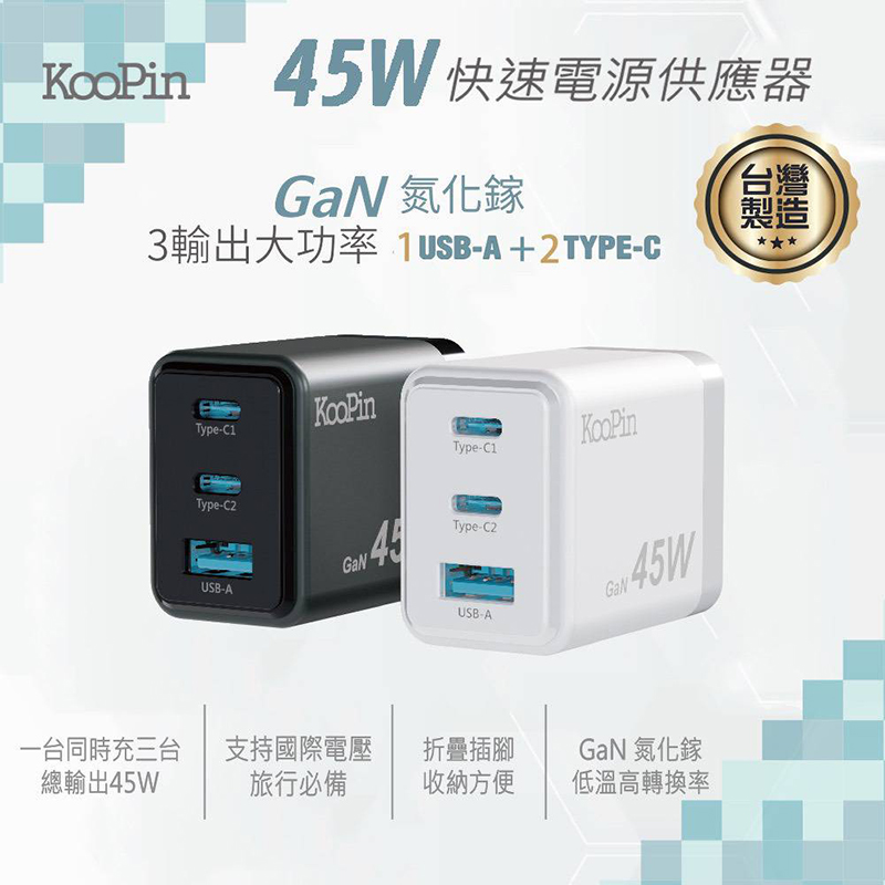 KooPin 45W氮化鎵 雙USB-C+USB-A手機快充充電器(黑色)