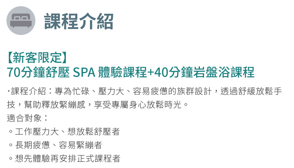母親節限定!【薇朵漾美學|新客限定】70分鐘舒壓 SPA 體驗課程|送岩盤浴40分鐘課程