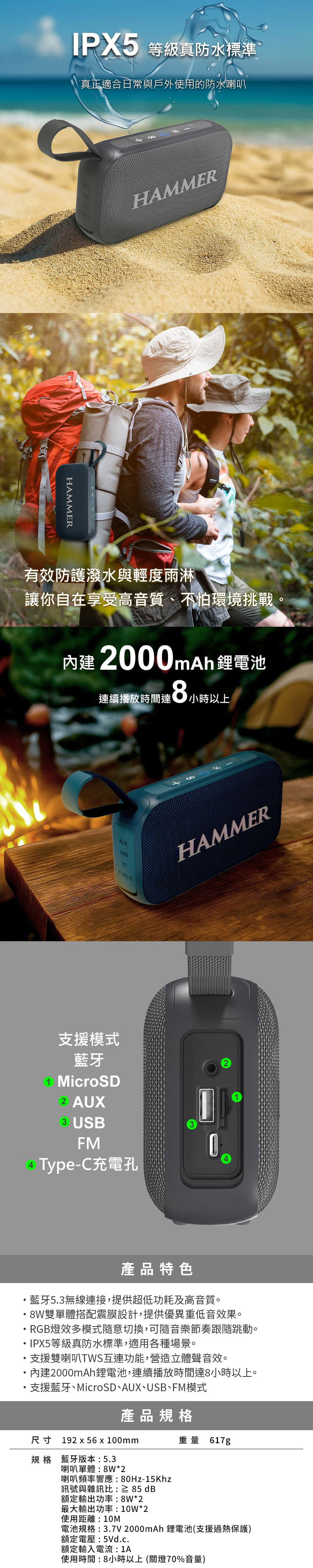 ★IPX5真防水標準,適用各種場景,支援藍牙、MicroSD、AUX、USB、FM模式。
