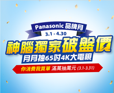 Panasoinc多款熱銷家電,神腦獨家破盤價,電視影音58折起、廚房家電72折起、美容家電84折起等,想買到超值價格,絕對要把握3月Panasoinc品牌月,還可月月抽65吋獨家大電視,此外還有你消費我買單的活動,3/31前滿萬再抽萬元紅利,也許這個月幸運兒就是你!