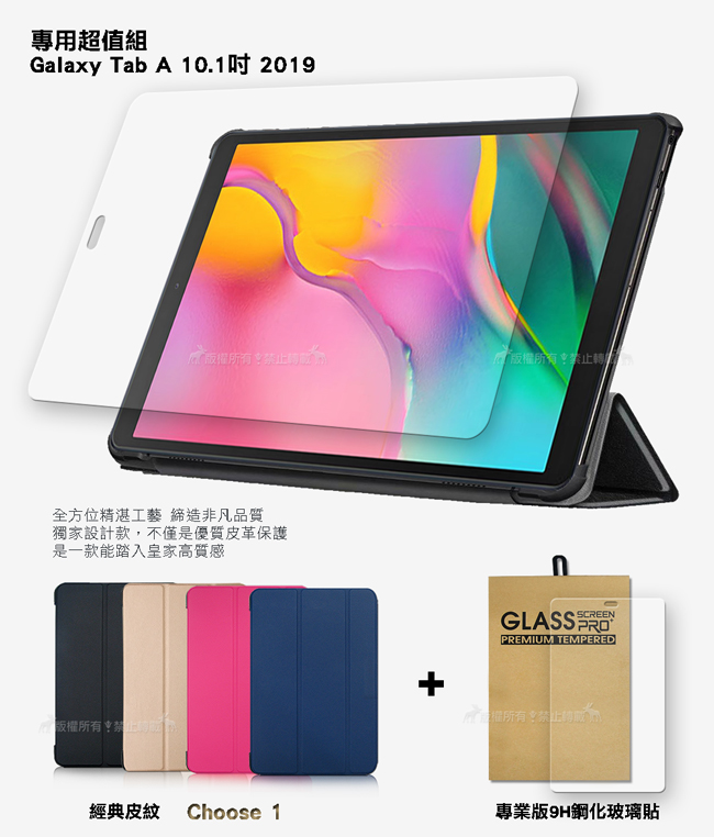 三星 Samsung Galaxy Tab A 10.1吋 2019 經典皮紋三折皮套+9H鋼化玻璃貼(合購價) T510 T515