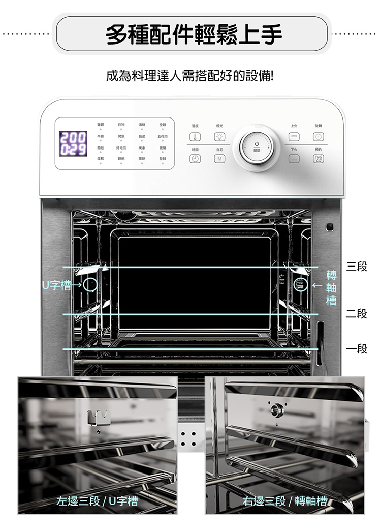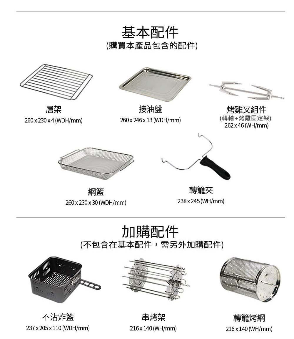 5件組配件:層架、瀝油盤、轉軸+烤雞固定架、轉籠夾、細網籃