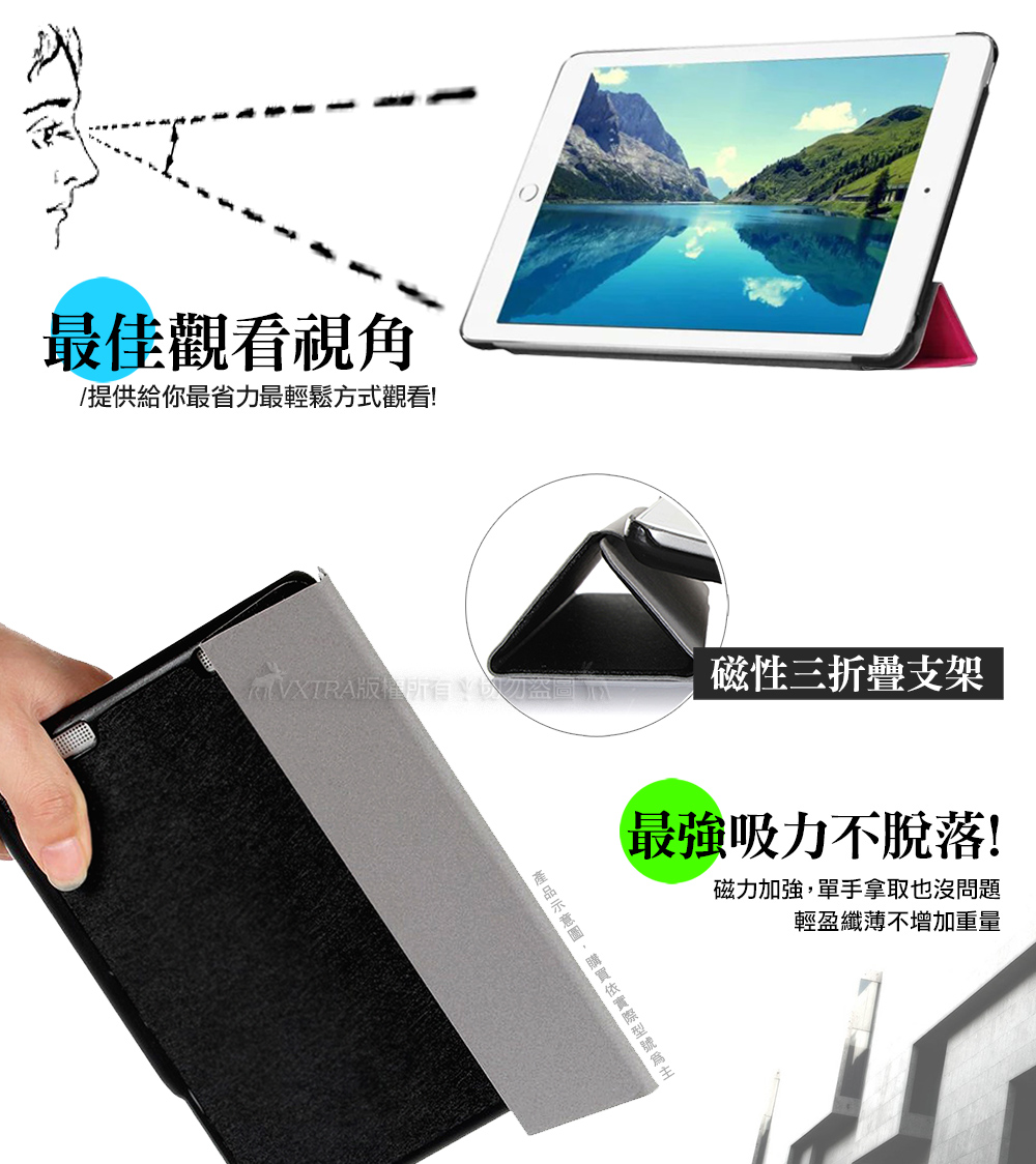 皮革紋最耐看,隱形磁扣最貼心 最穩固三折式折疊支架,完美體驗 易拆卸、耐髒,耐用度加倍