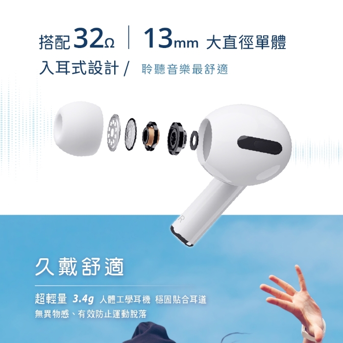 2. 搭配32Ω 13mm大直徑單體入耳式設計聆聽音樂最舒適