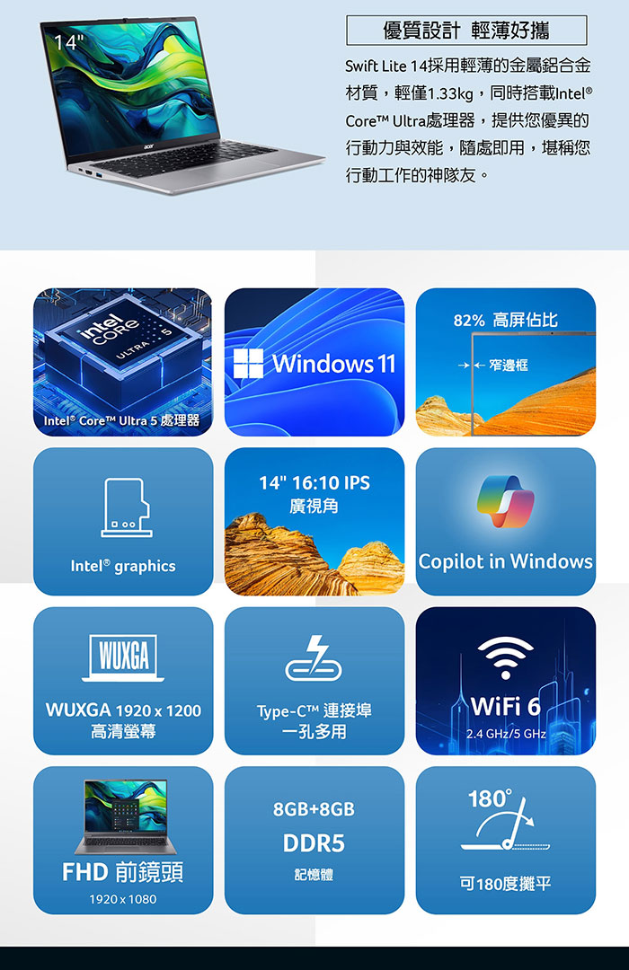 《Acer 宏碁》SFL14-51M-50W8(14吋WUXGA/Ultra 5 125U/8G+16G/2TB PCIe SSD/Win11/特仕版)