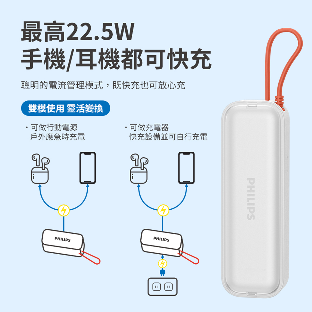 【PHILIPS飛利浦】FunCube BAR 22.5W 旅充式 Type-C自帶線 AC行動電源(DLP5201C)_野性綠