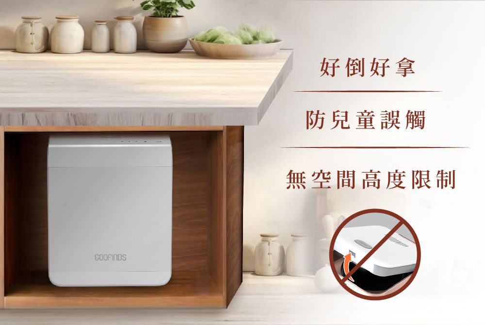 而分離式的設計讓你無須擔心上方櫃子是否會遮擋到廚餘開孔,導致機器無法開啟